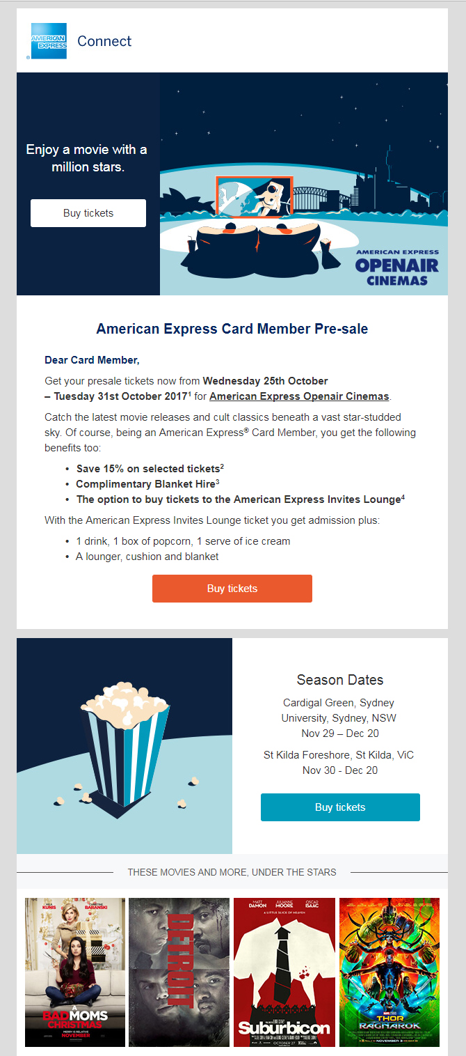 Additionally, I managed all of the bank partners promotion of loyalty promotions and brand events such as the annual Amex Shop Small campaign, Vivid Sydney, Amex Openair Cinema and more.