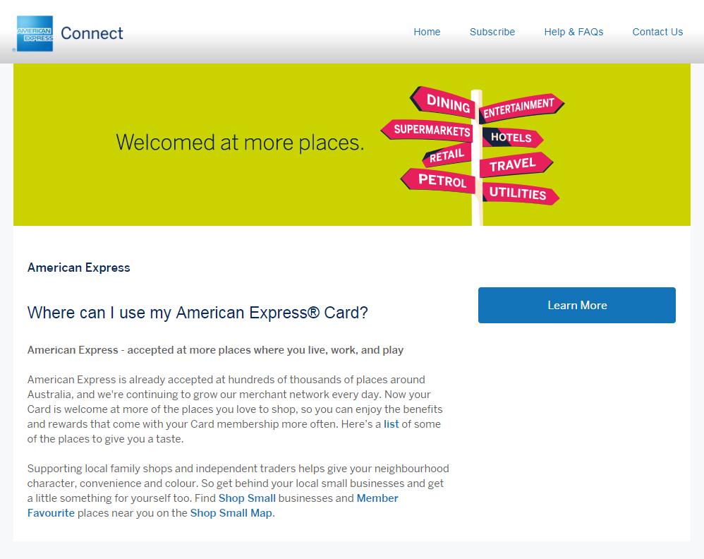 At American Express I managed the loyalty and Amex Offers website amexconnect.com.au and all Amex Connect marketing campaigns to members, plus bank partner marketing American Express card campaigns directly with the big four banks. The Amex Connect website was for bank issued Amex card members (ANZ, CommBank, NAB & Westpac).