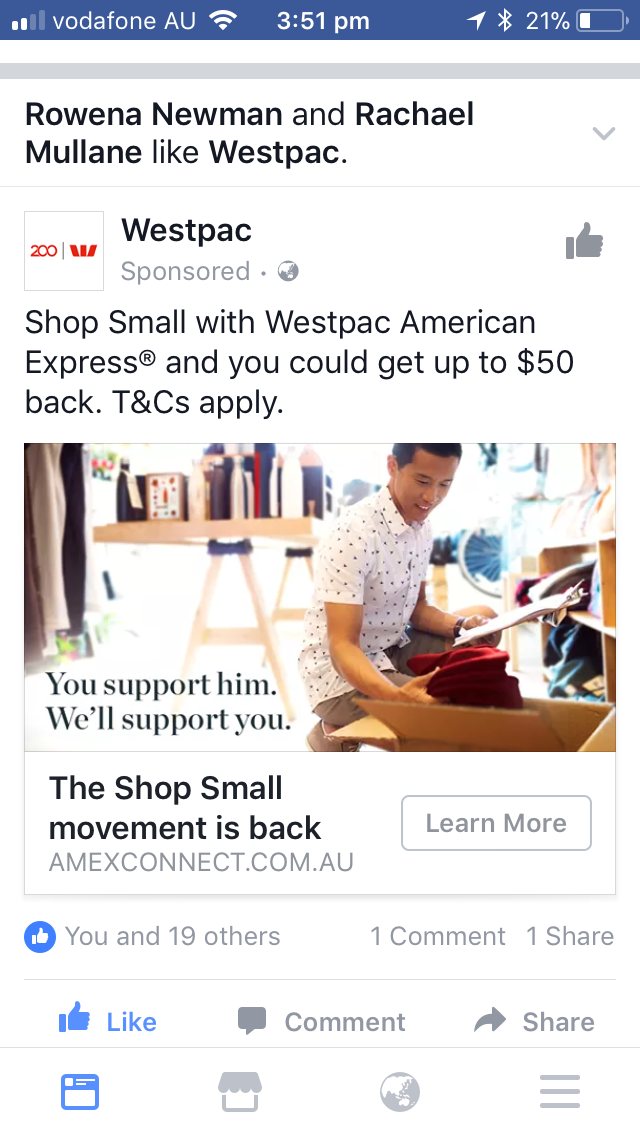 Promotion by the big 4 banks of Amex’s annual Shop Small Campaign across multiple bank channels; website email, banner ads, Westpac Altitude Black website pages, social media posts, ATM screens, credit card statement inserts and more.
