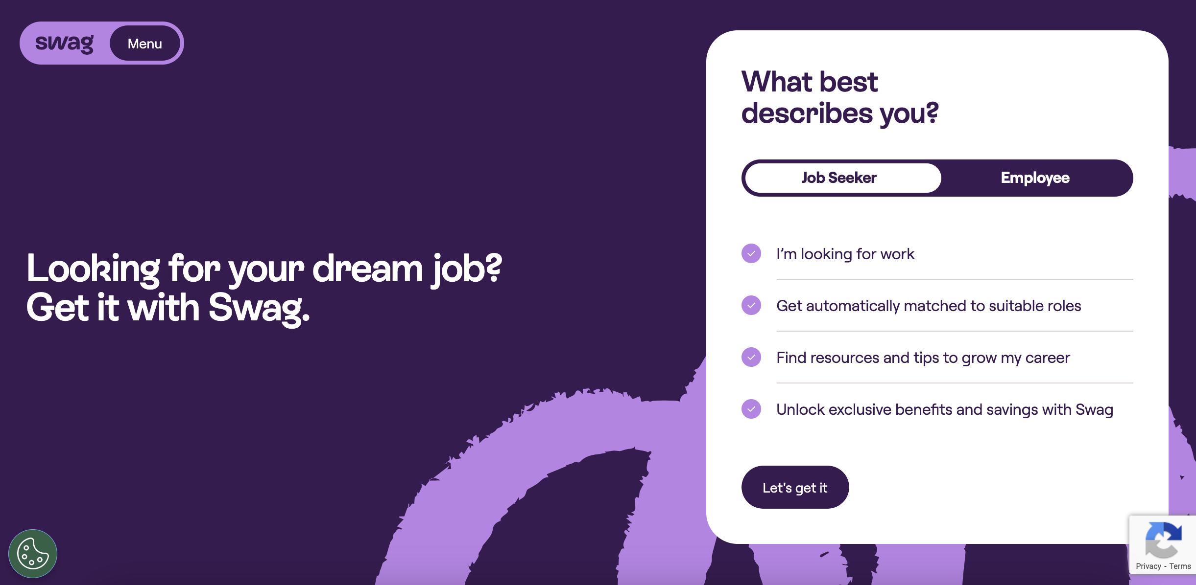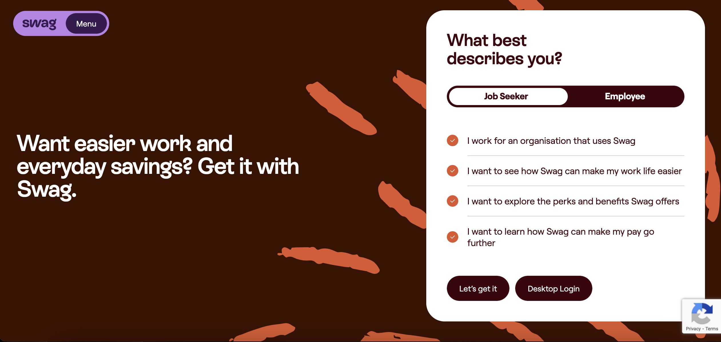 I was tasked with the brand development, GTM strategy, launch of a new B2C sub-brand Swag and the Swag app (now renamed Employment Hero Work) for Employment Hero. The Swag app consisted of four pillars; Work, Money, Career and Benefits and is for employees who work for an employer that uses Employment Hero HR software or for applicants who have applied for a role at an employer who uses Employment Hero’s job application platform.
